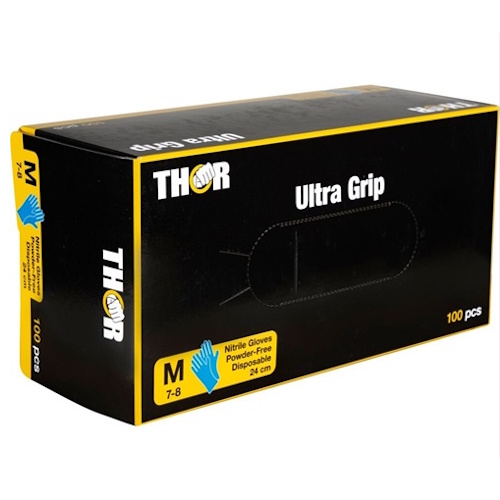 THOR Ultra Grip — vienkartinės nitrilinės pirštinės, skirtos profesionaliam ir namų naudojimui. Bekvapės, be latekso, pagamintos iš 100% nitrilo, atsparios cheminėms medžiagoms ir plyšimams. Tekstūruotos delno sritys užtikrina puikų sukibimą ir tikslumą darbų metu.