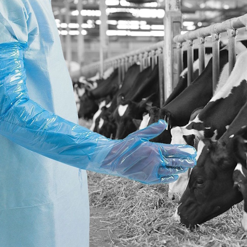 Mėlynos polietileninės pirštinės pagamintos iš aukštos kokybės LDPE polietileno, be pudros. Dėl lygaus paviršiaus šios pirštinės yra tvirtos, tačiau jautrios. Plačiai naudojamos veterinarijos reikmėms, tokioms kaip apžiūros, veršiavimasis ir t.t.